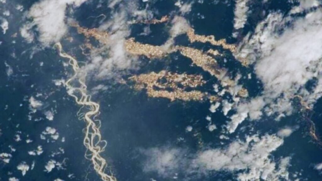 The photograph was slightly edited to enhance contrast, but the golden glow is no trick. The sunlight hits the pools and lagoons created by mining, generating a metallic reflection visible even from Earth’s orbit. The winding channels to the left of the image correspond to the Inambari River and the Tambopata National Reserve, two legally protected areas constantly threatened by gold extraction.